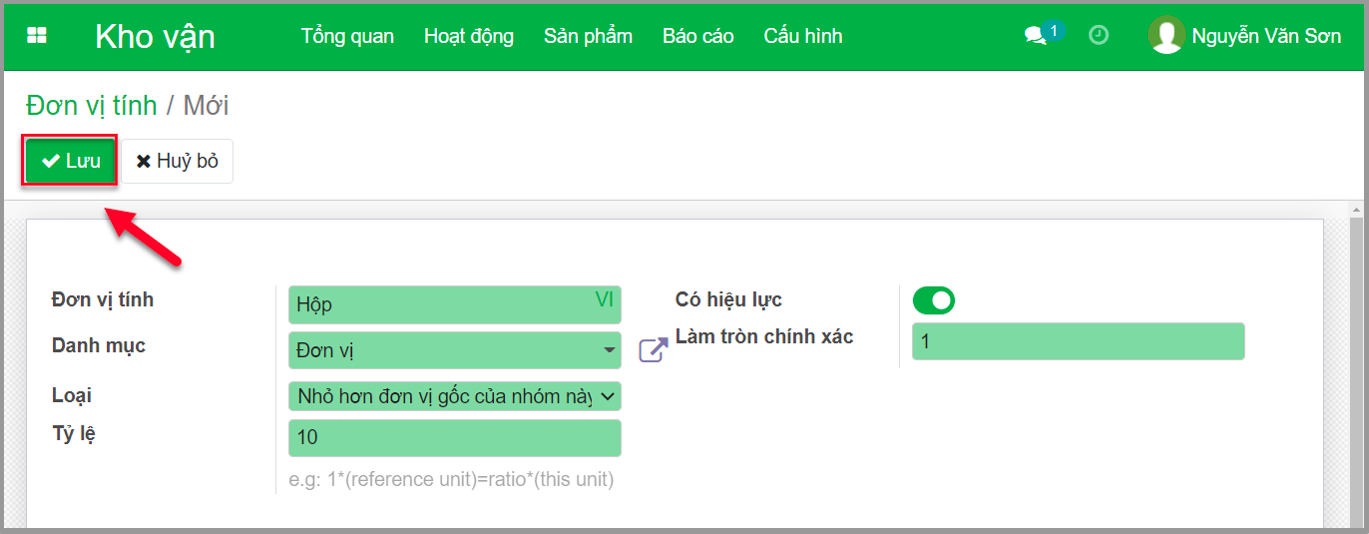 Ví dụ hình dưới đây: đơn vị gốc của nhóm “**Đơn vị**” là Thùng, và chúng ta đang muốn tạo thêm 1 đơn vị là Hộp để lưu kho, với giá trị quy đổi 1 Thùng = 10 Hộp.