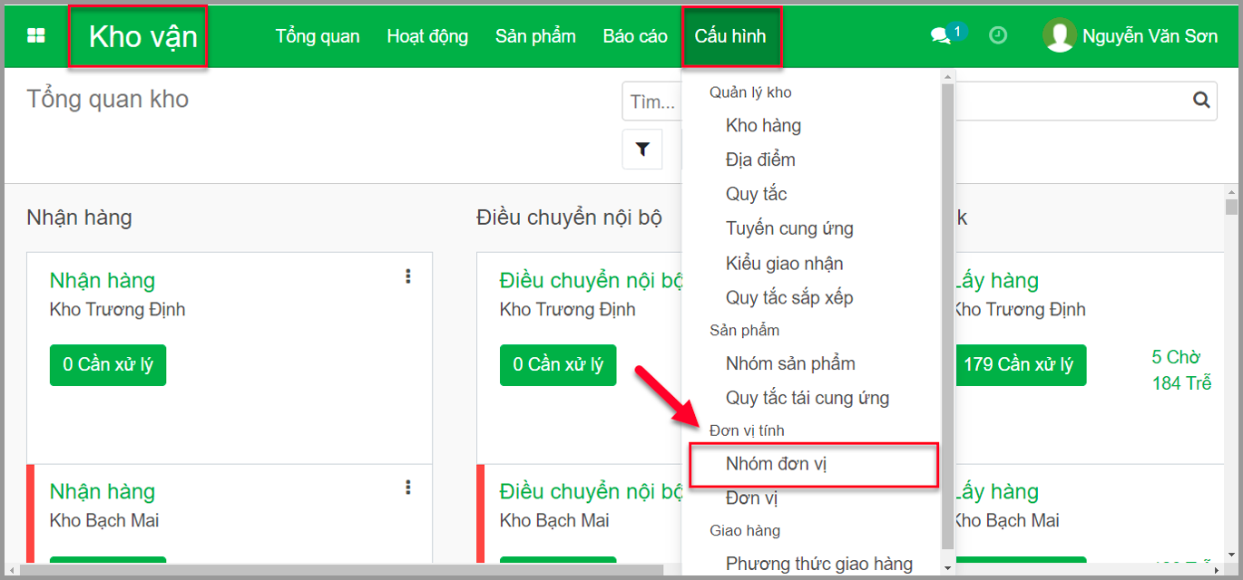 **Bước 1**: Truy cập menu: **Kho vận**/**Cấu hình**/**Nhóm đơn vị**