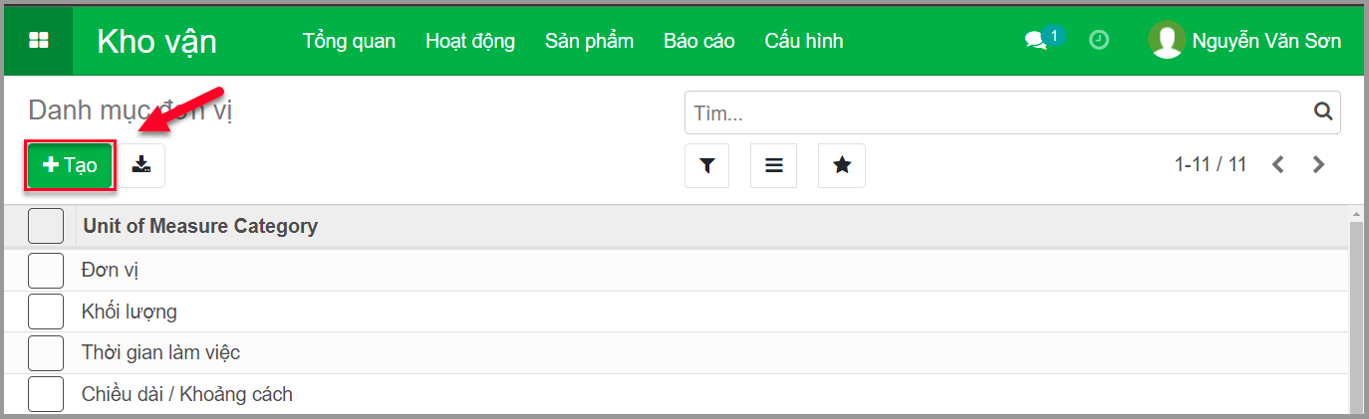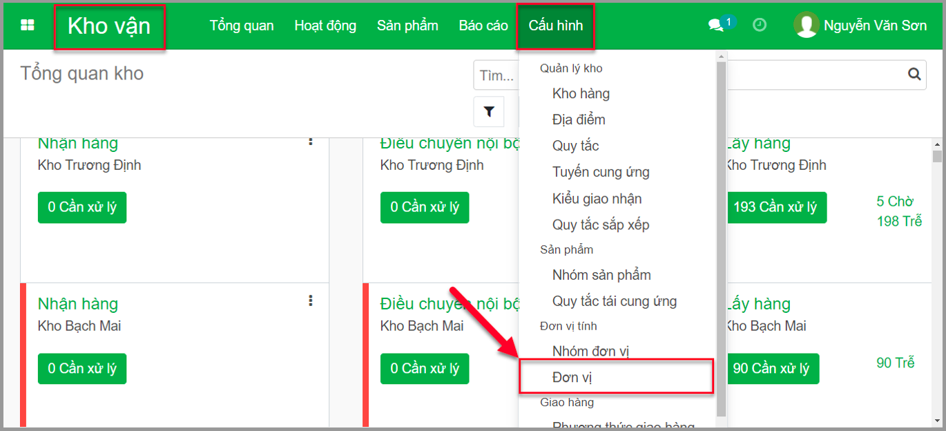 **Bước 1:** Truy cập menu **Kho vận**/**Cấu hình**/**Đơn vị**.